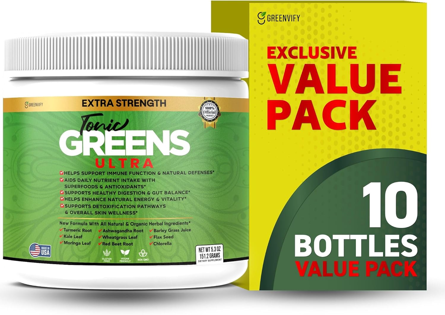 Tonic Greens Ultra is a premium organic greens superfood powder formulated to support immune function, digestive health, and natural energy levels. Our blend of organic ingredients includes Turmeric Root, Moringa Leaf, Ashwagandha, Wheatgrass, Red Beet Root, and more, providing a powerful boost of antioxidants and essential nutrients.This nutrient-rich formula promotes healthy digestion, gut balance, and detoxification pathways while enhancing your overall skin wellness. Made with gluten-free, vegan-friendly, and non-GMO ingredients, Tonic Greens Ultra is a convenient and natural way to nourish your body.Simply mix one scoop with 8 ounces of water or your favorite beverage for a revitalizing daily supplement that supports your active lifestyle.Note: These statements have not been evaluated by the Food and Drug Administration. This product is not intended to diagnose, treat, cure, or prevent any disease.